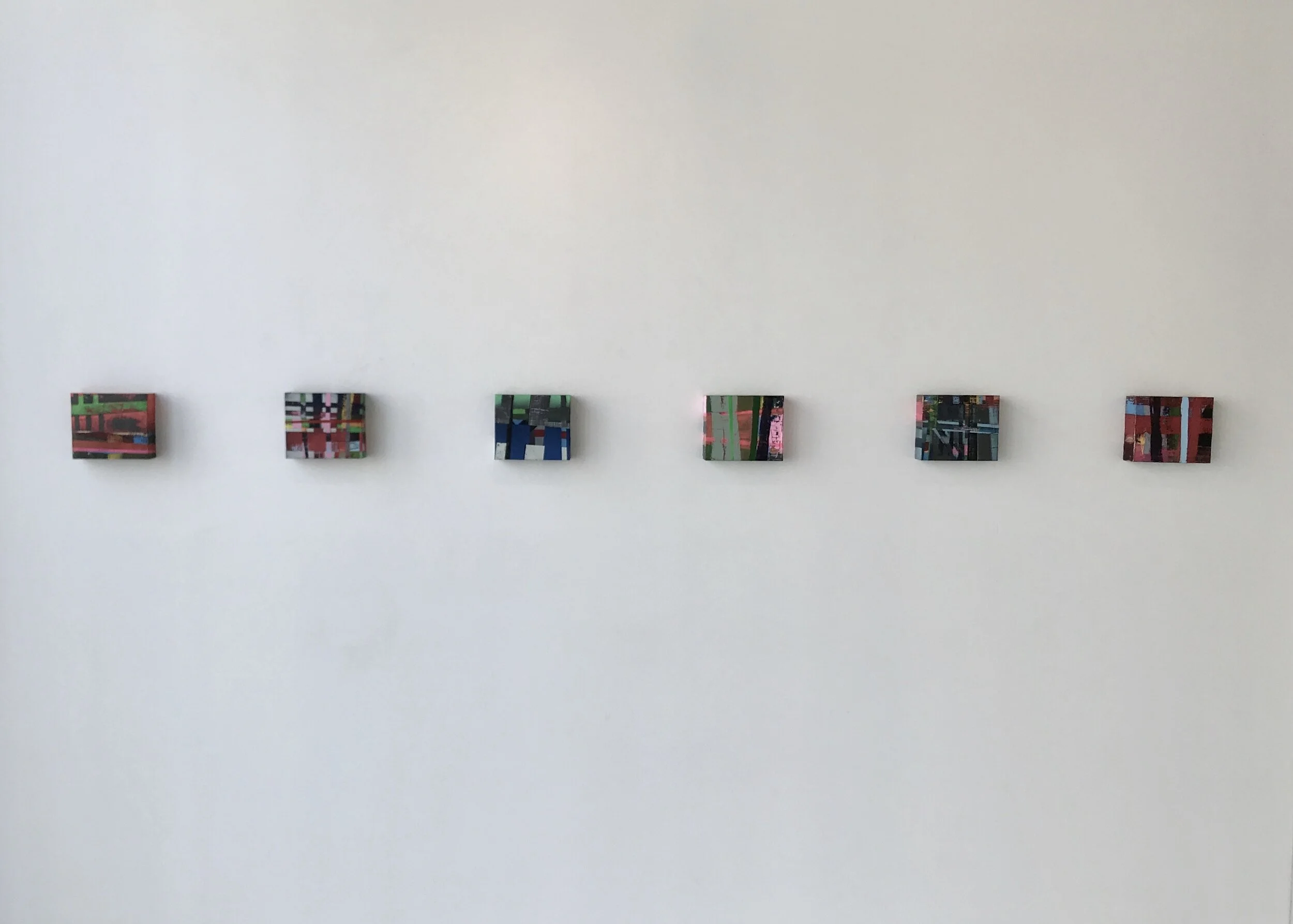 My approach to these paintings is skewed, and indirect - an attempt to mimic anxiety by keeping the work in the peripheries physically, and mentally. Color selections are not random, but they are not dwelled upon, either. I don’t work from a prepared palette, but from a chaotic pile of paint tubes. Each color is direct from the tube, or mixed and used once. Residue from one color is often mixed into the next (further destabilizing the process), and the process is repeated. Layers of color are built up, and then broken down with solvents, and abrasives.